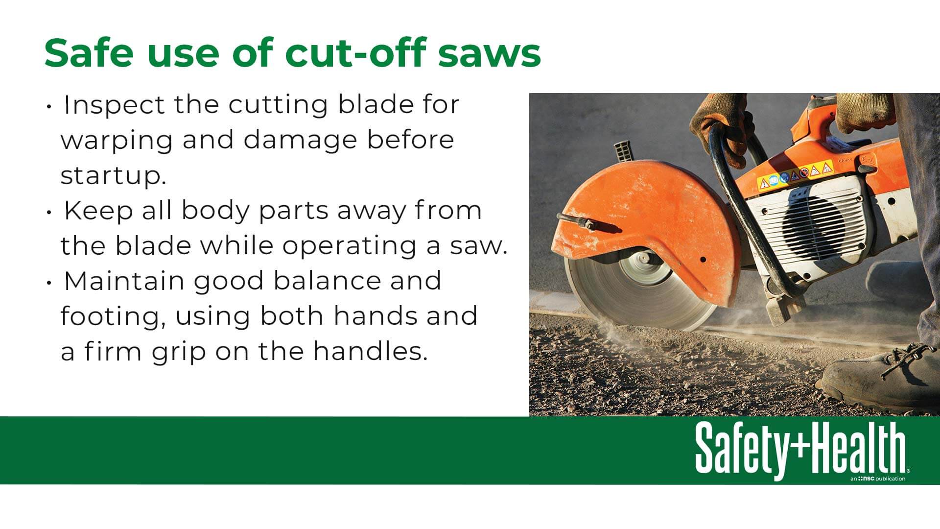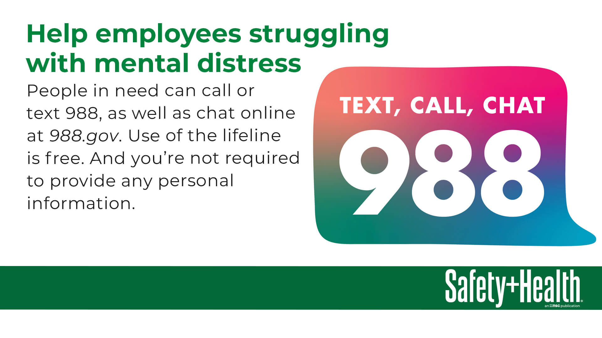 Relay simple safety messages to your employees every day. NSC Digital Signage can be scrolled on your reception or lunchroom monitors, shared on your Intranet and used in other internal communications. It is available in .JPG and .PDF formats, and encompasses multiple safety topics.